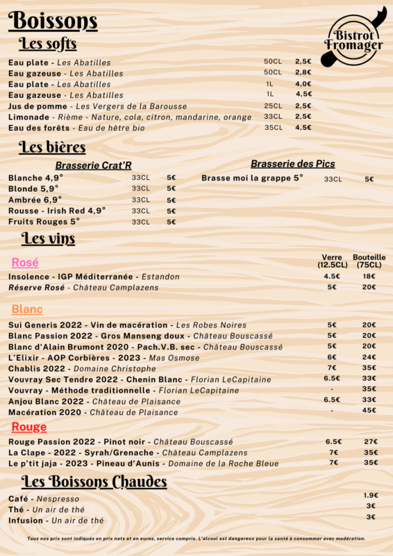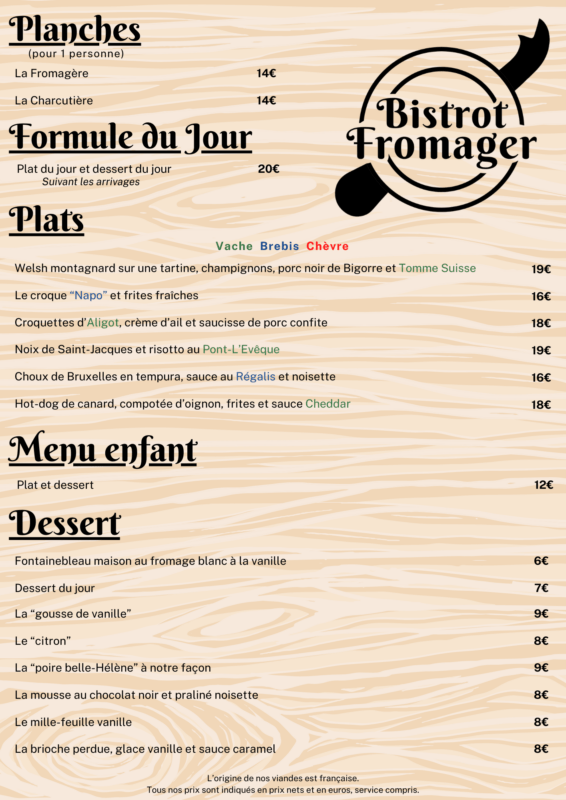 Nous vous y proposerons tous les midis du lundi au samedi un menu du jour qui mettra en valeur les fromages ainsi que les produits de notre région.